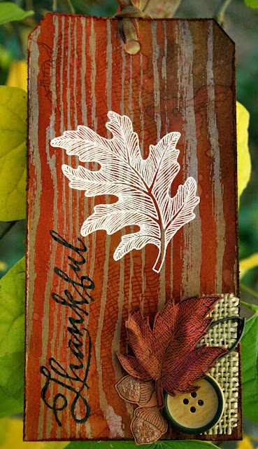 This month's tag is all about fall. I decided to do two versions since I wasn't sure the woodgrain from the Natural Composition designer series paper was going to work. Once again I'm using all Stampin' Up! products to show you that you don't have to go out and buy all new stuff. I started by embossing a leaf from the Autumn Splendor set in white embossing powder rather than clear so it would stand out more against the textured cardstock. I then added the Elegant Beginnings sentiment using black stazon ink and applied various colors of re-inkers with water, drying each time with the heat tool. I used the Cheesecloth background stamp to add additional interest. I finished each tag by distressing the edges, adding a button, a piece of burlap, and leaves cut out of cardstock.